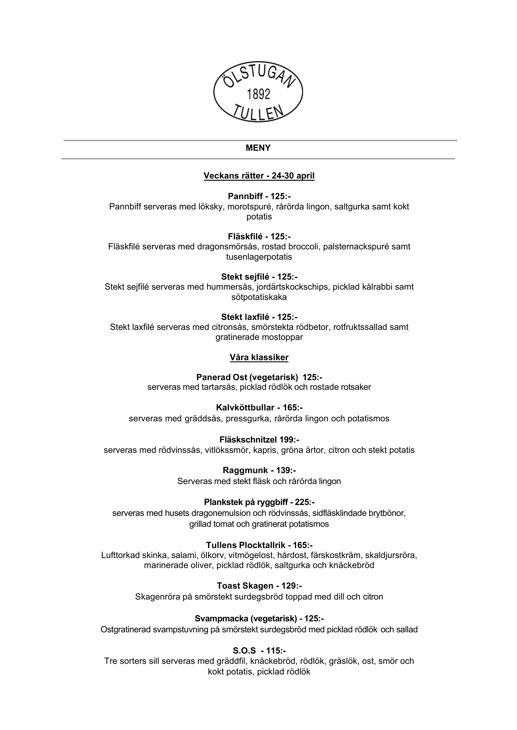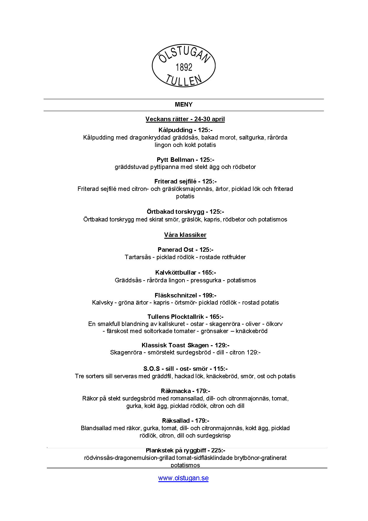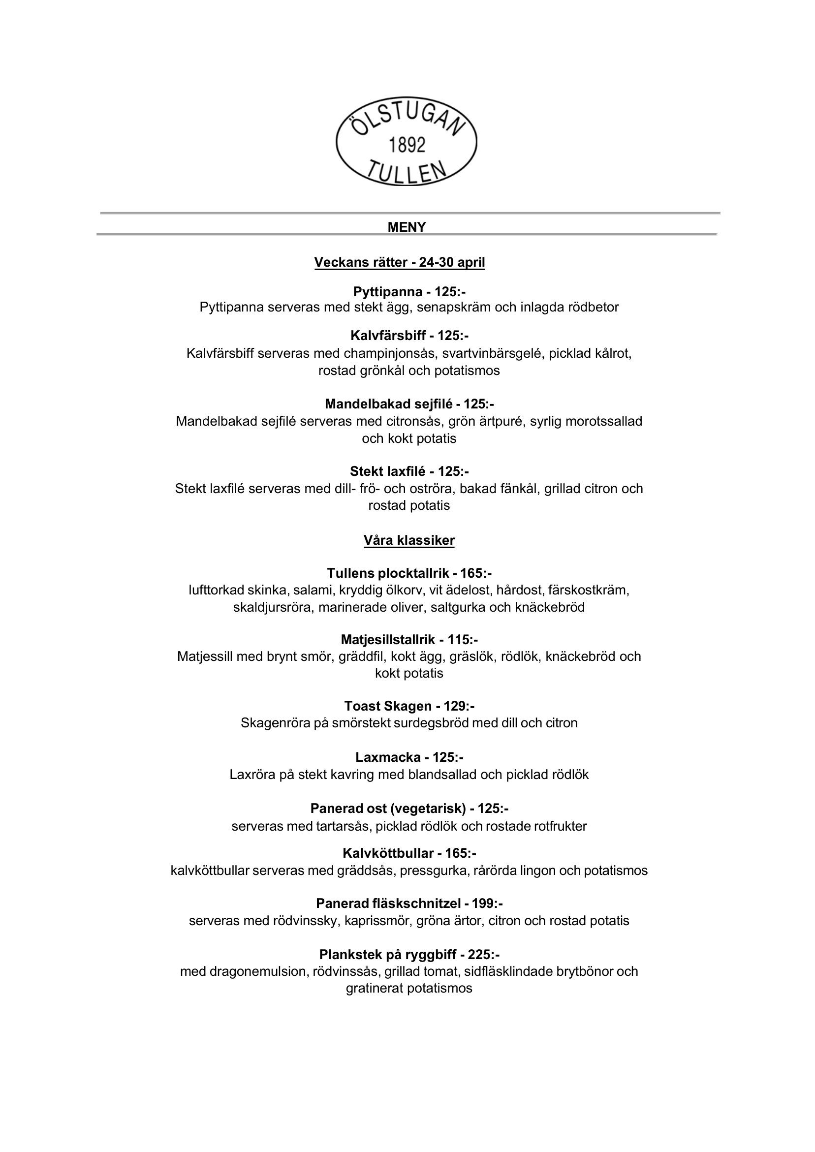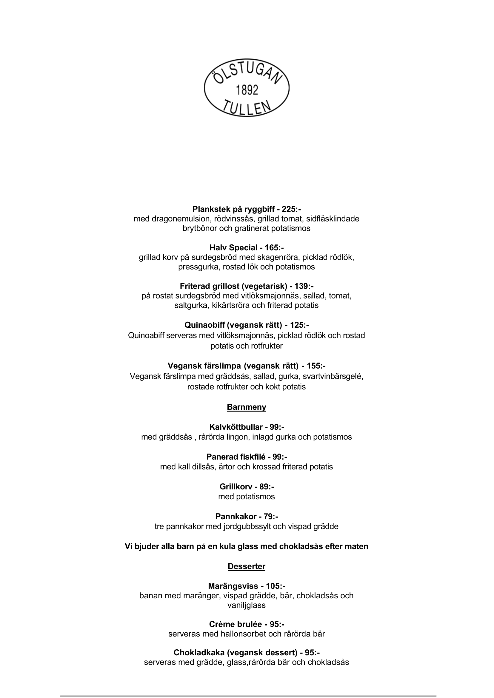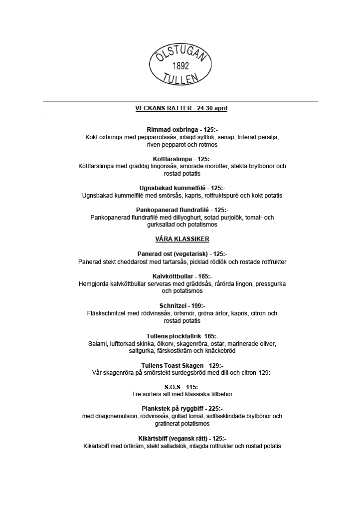 Vi erbjuder vällagad och varierad svensk mat till rimliga priser. För den törstige erbjuds ett stort sortiment av öl och dryck från hela Sverige.