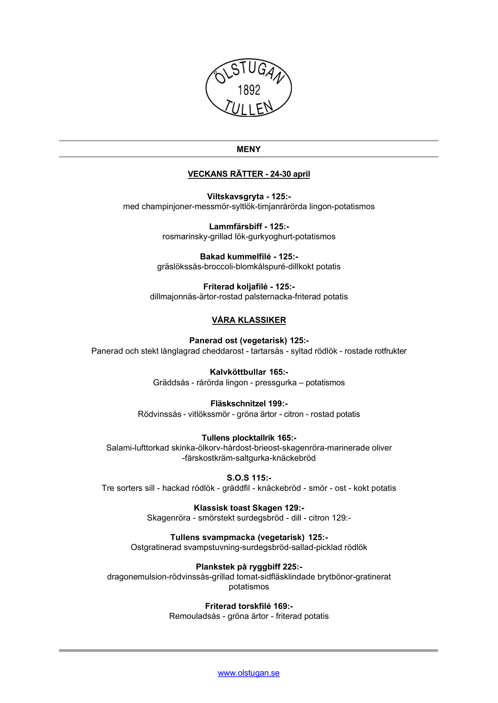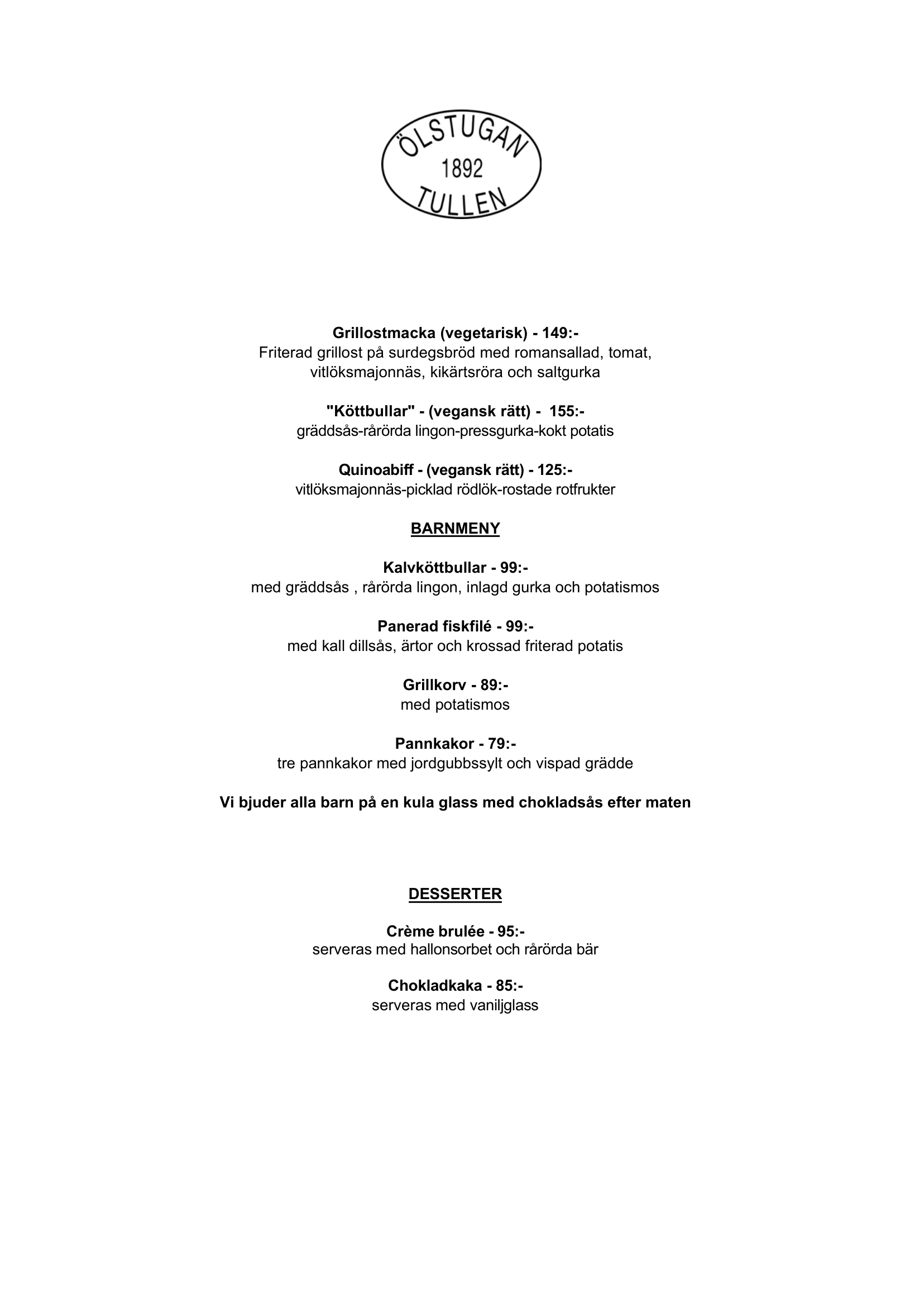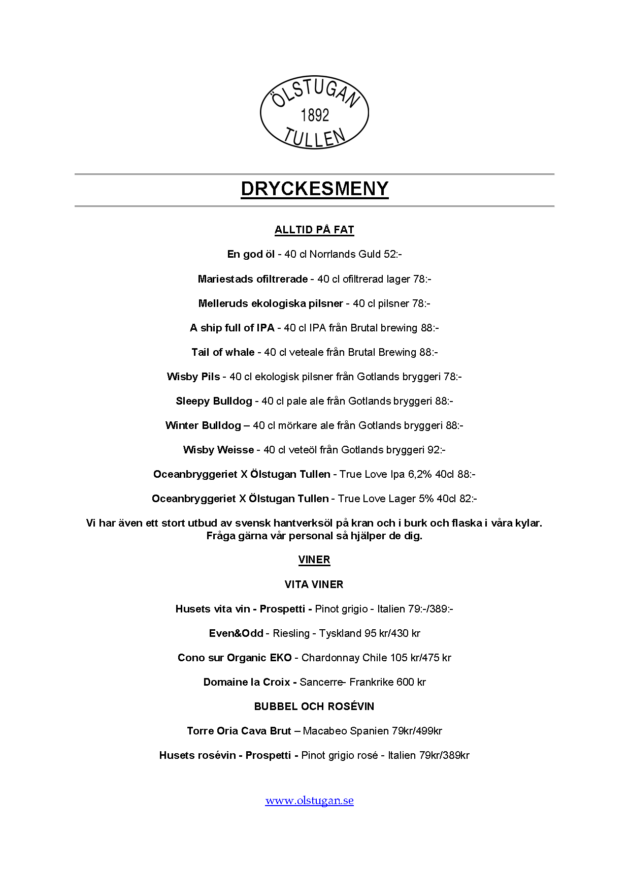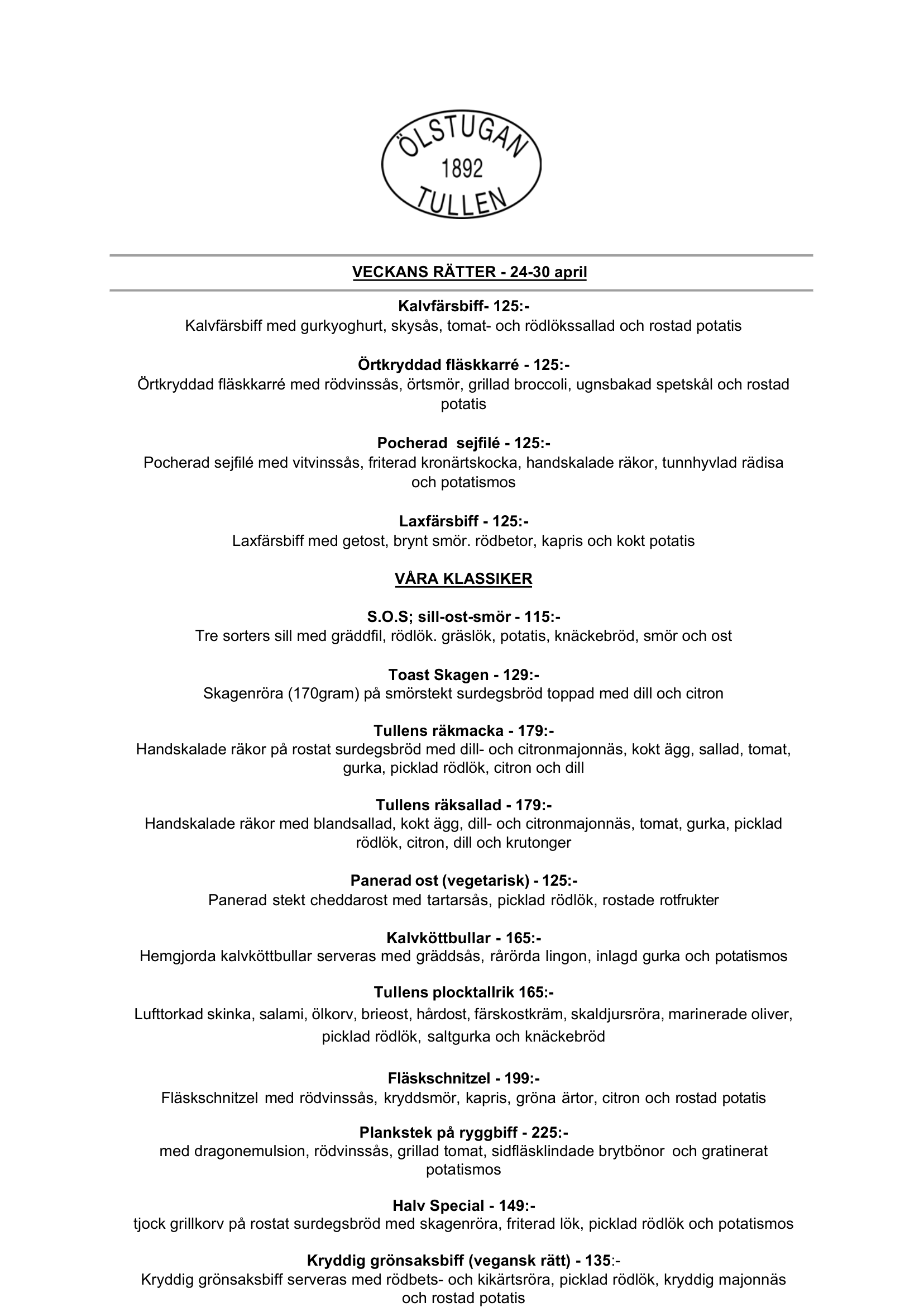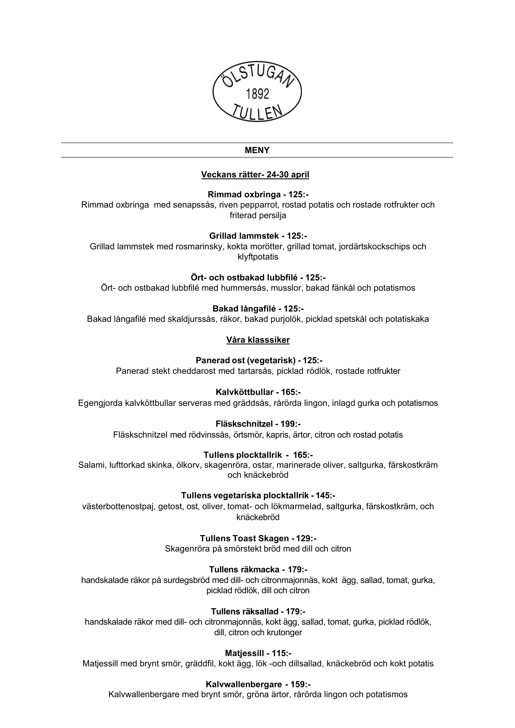 Vi erbjuder vällagad och varierad svensk mat till rimliga priser. För den törstige erbjuds ett stort sortiment av öl och dryck från hela Sverige.