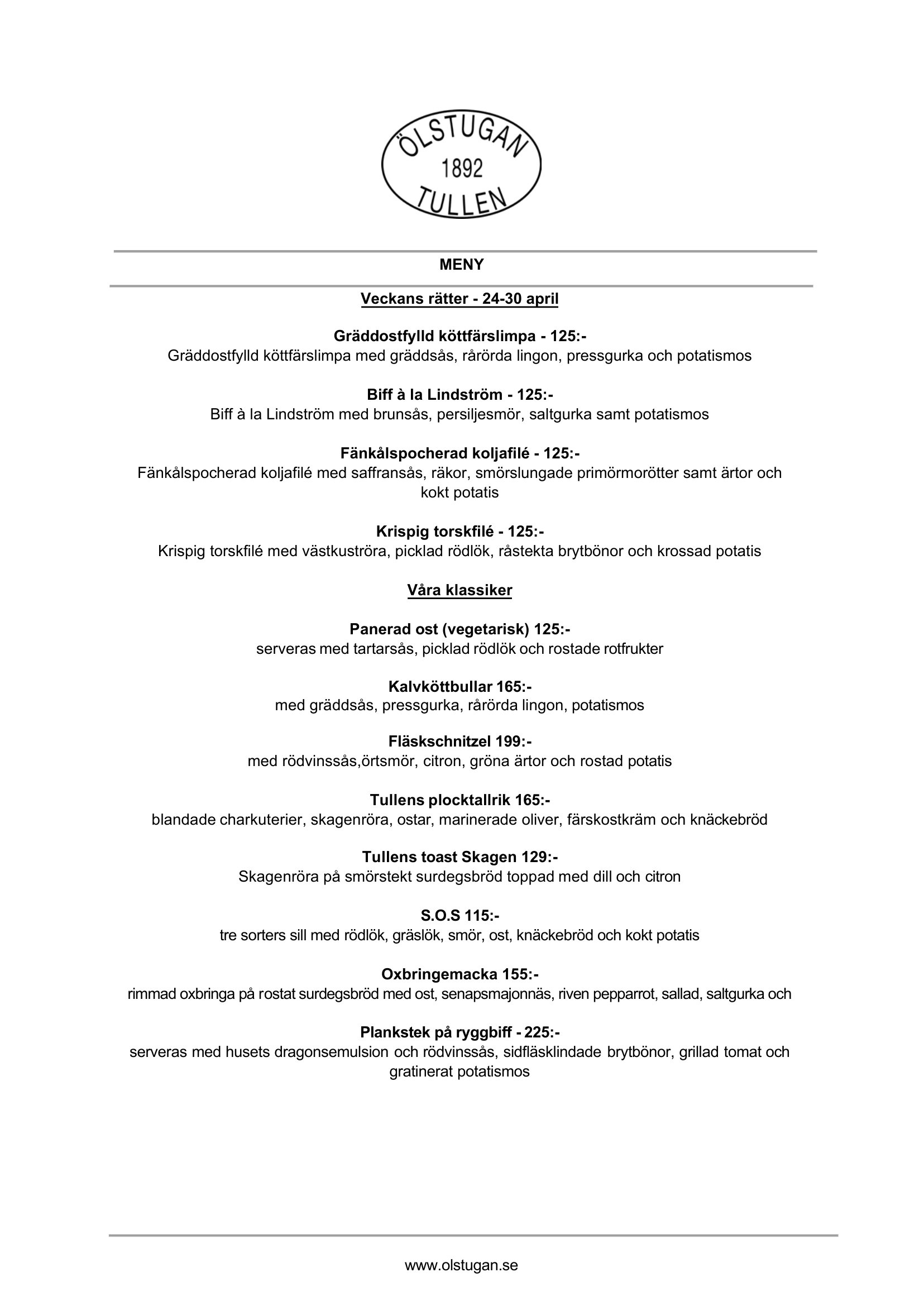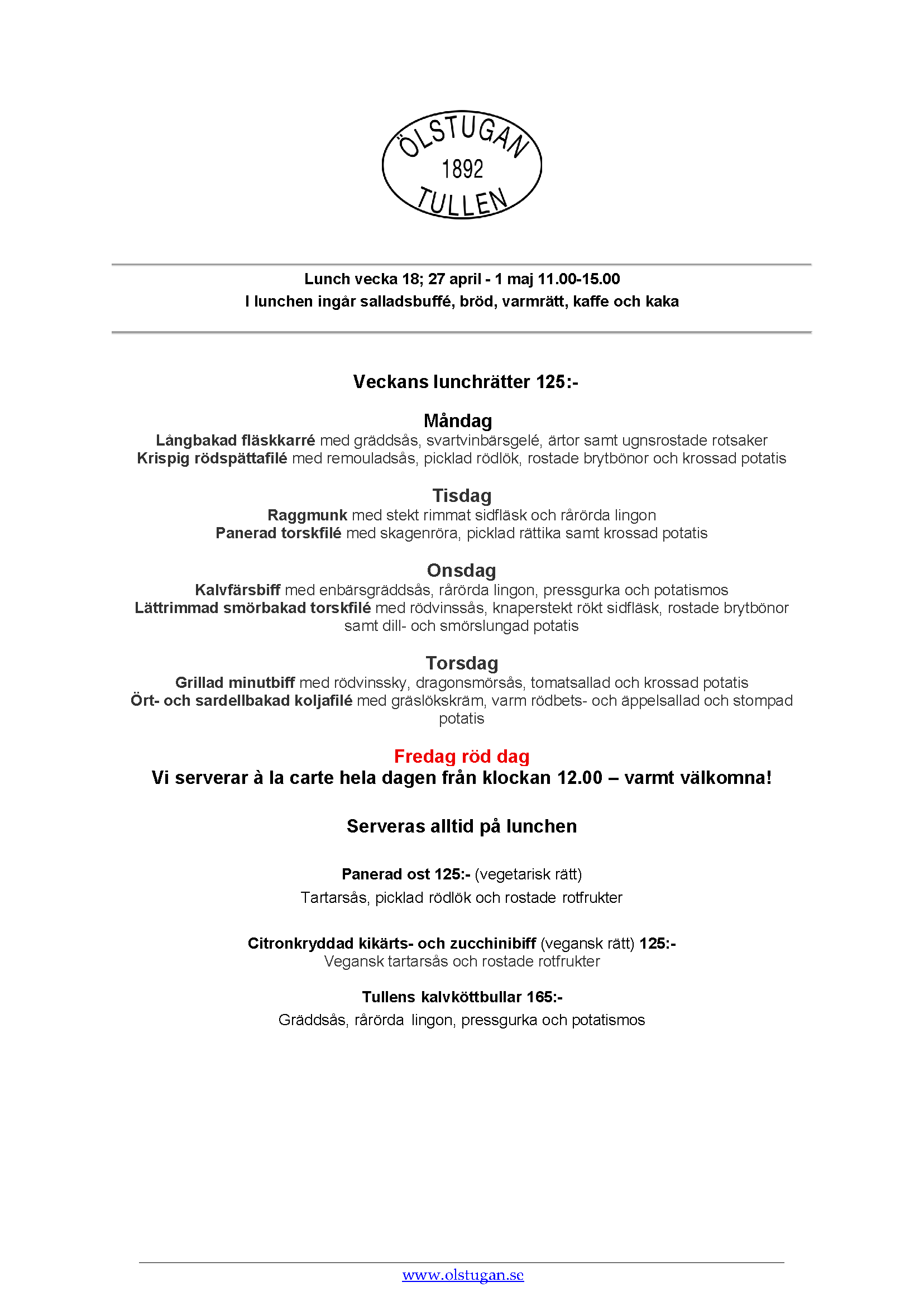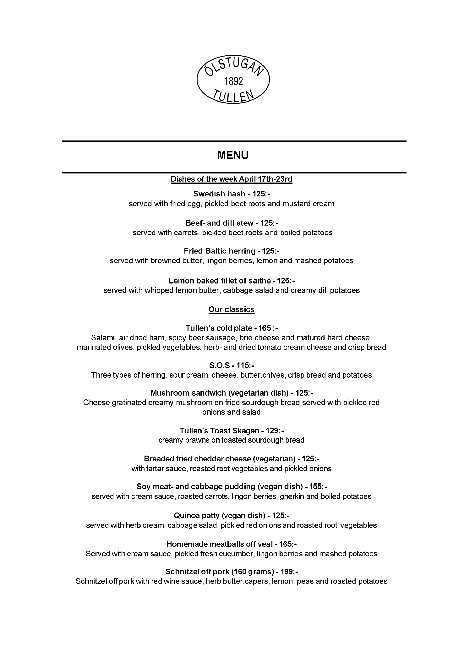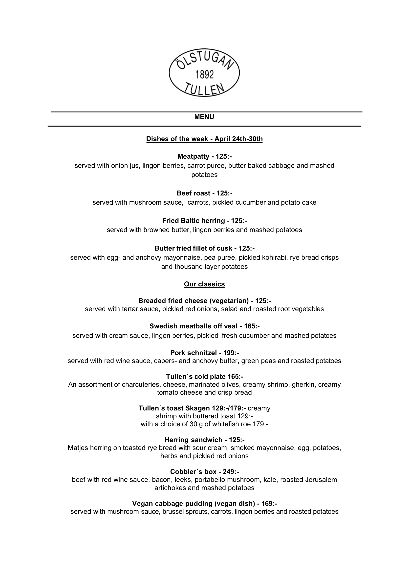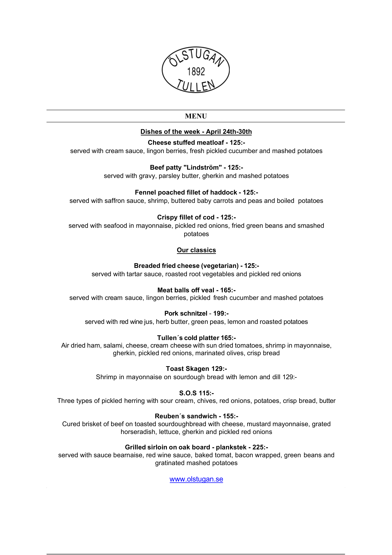 Vi erbjuder vällagad och varierad svensk mat till rimliga priser. För den törstige erbjuds ett stort sortiment av öl och dryck från hela Sverige.