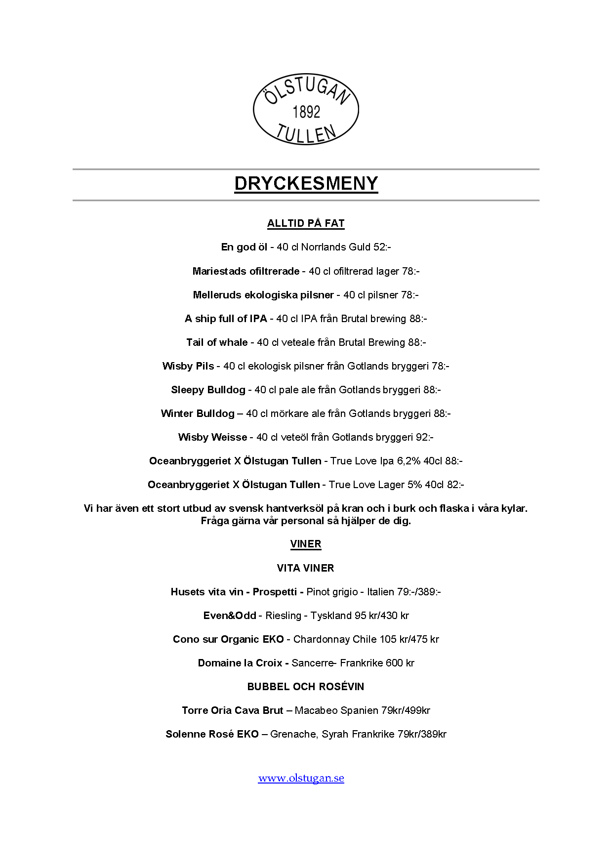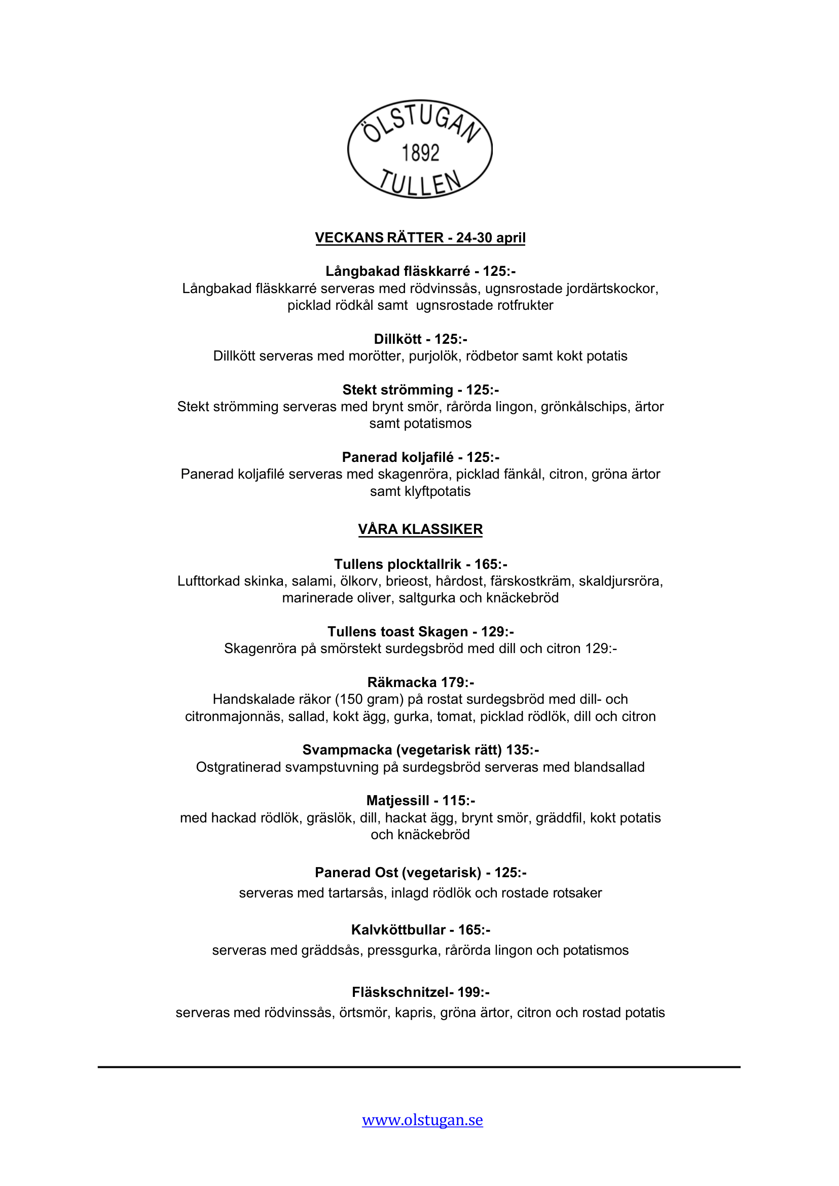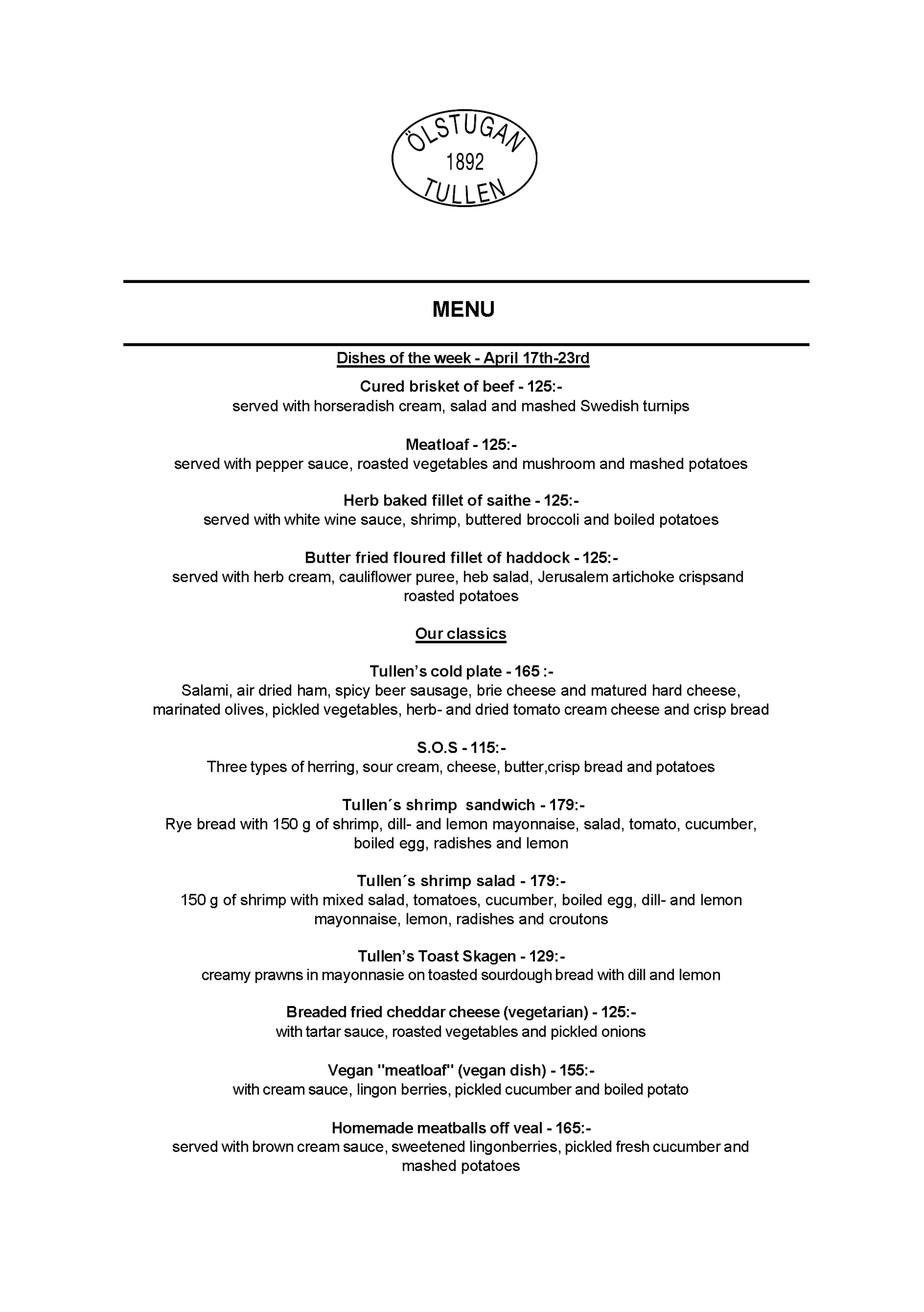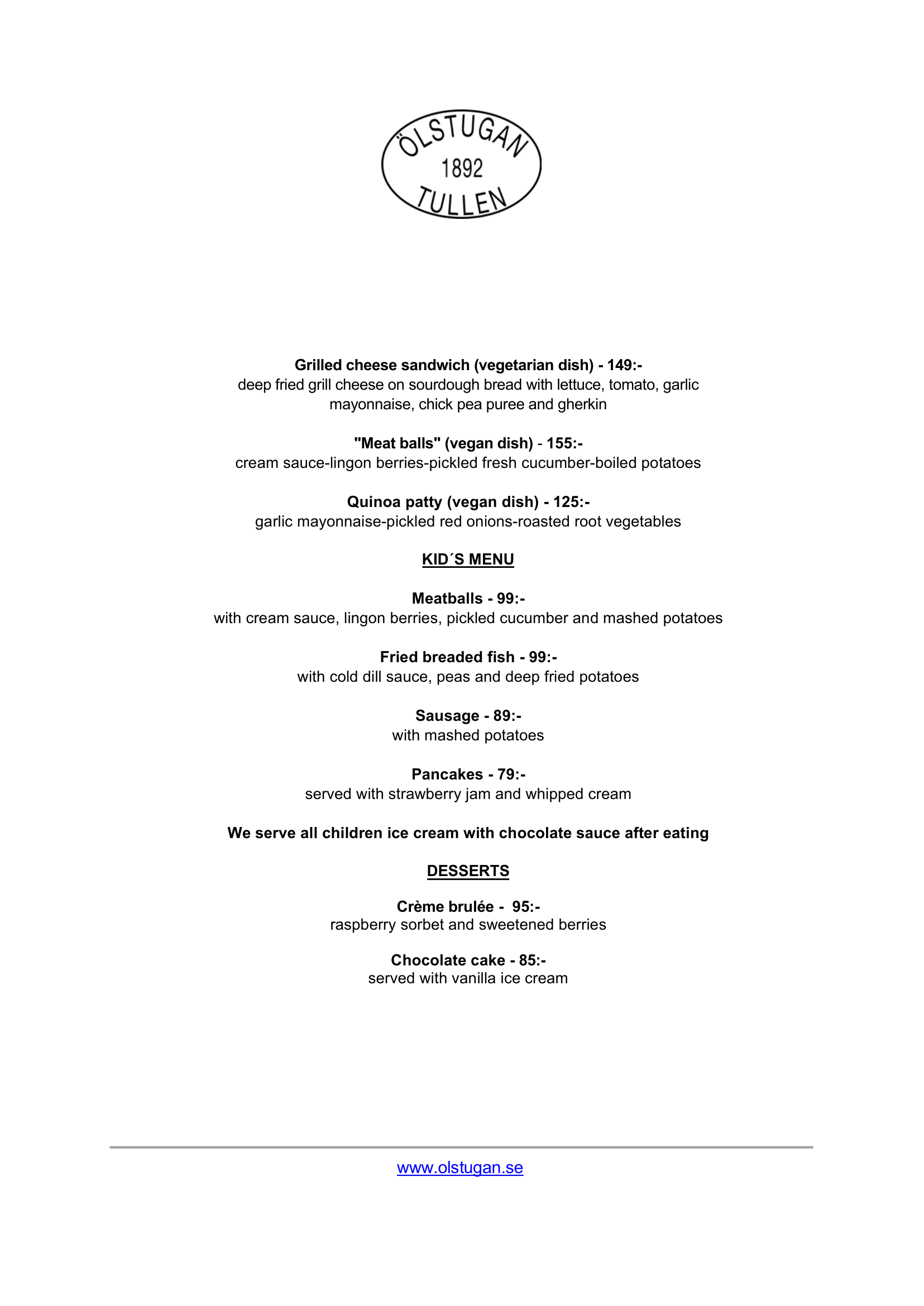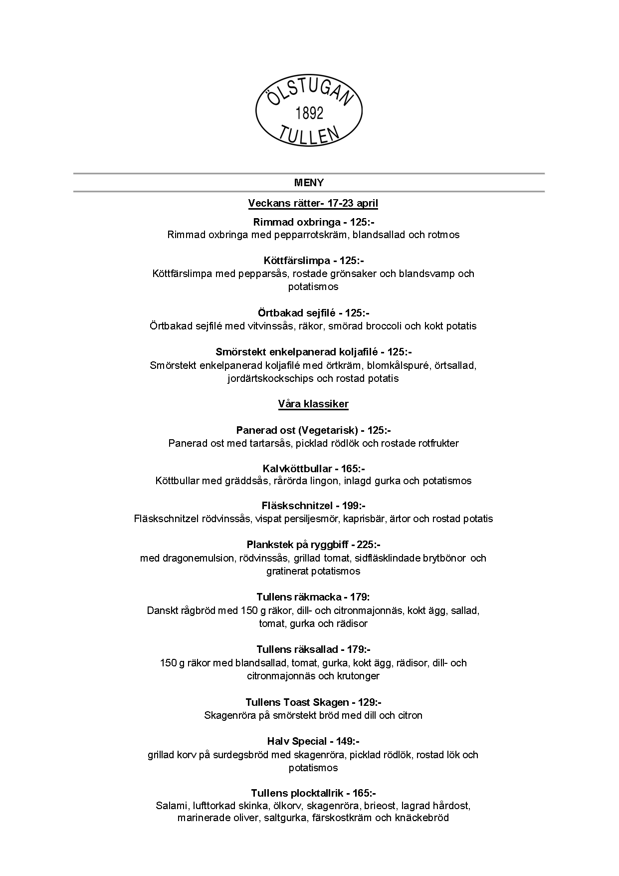 Vi erbjuder vällagad och varierad svensk mat till rimliga priser. För den törstige erbjuds ett stort sortiment av öl och dryck från hela Sverige.