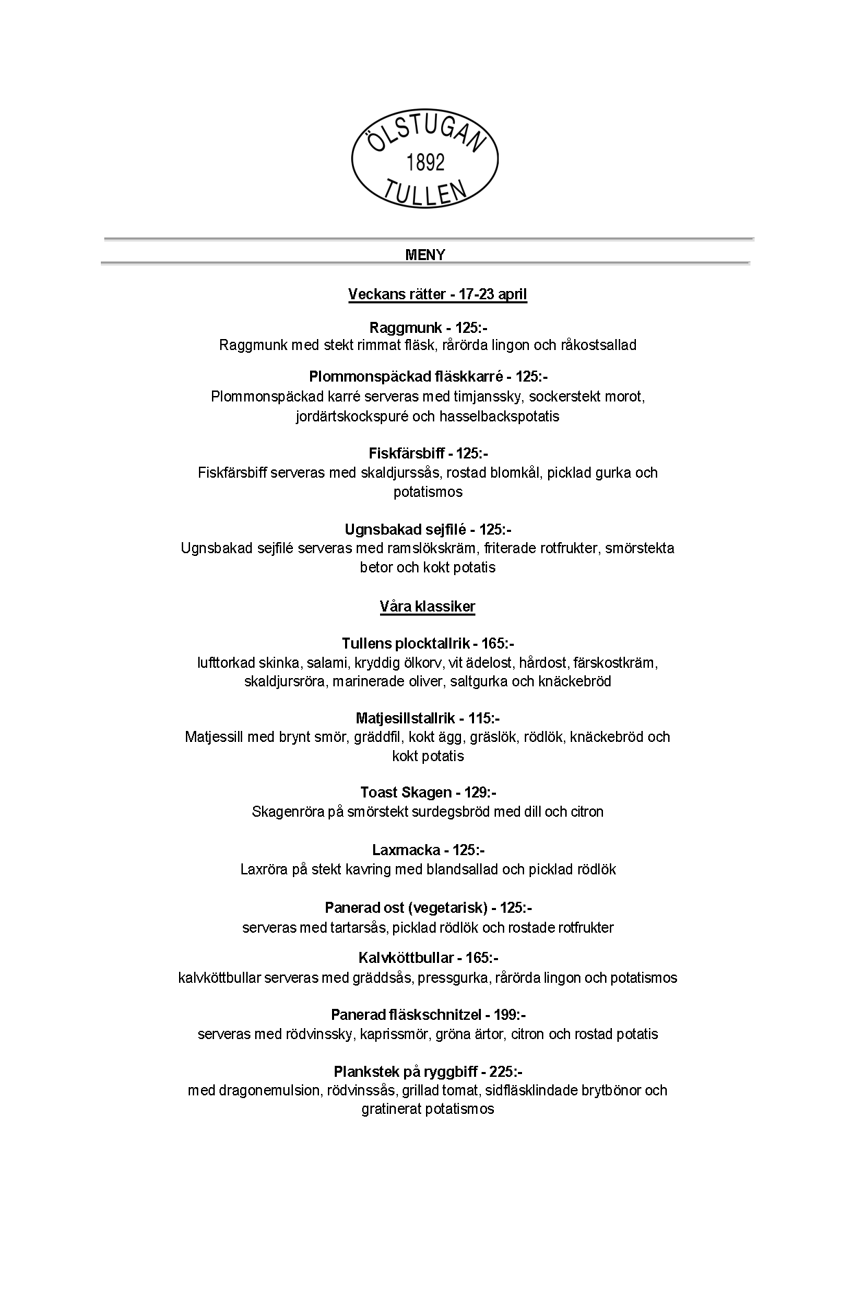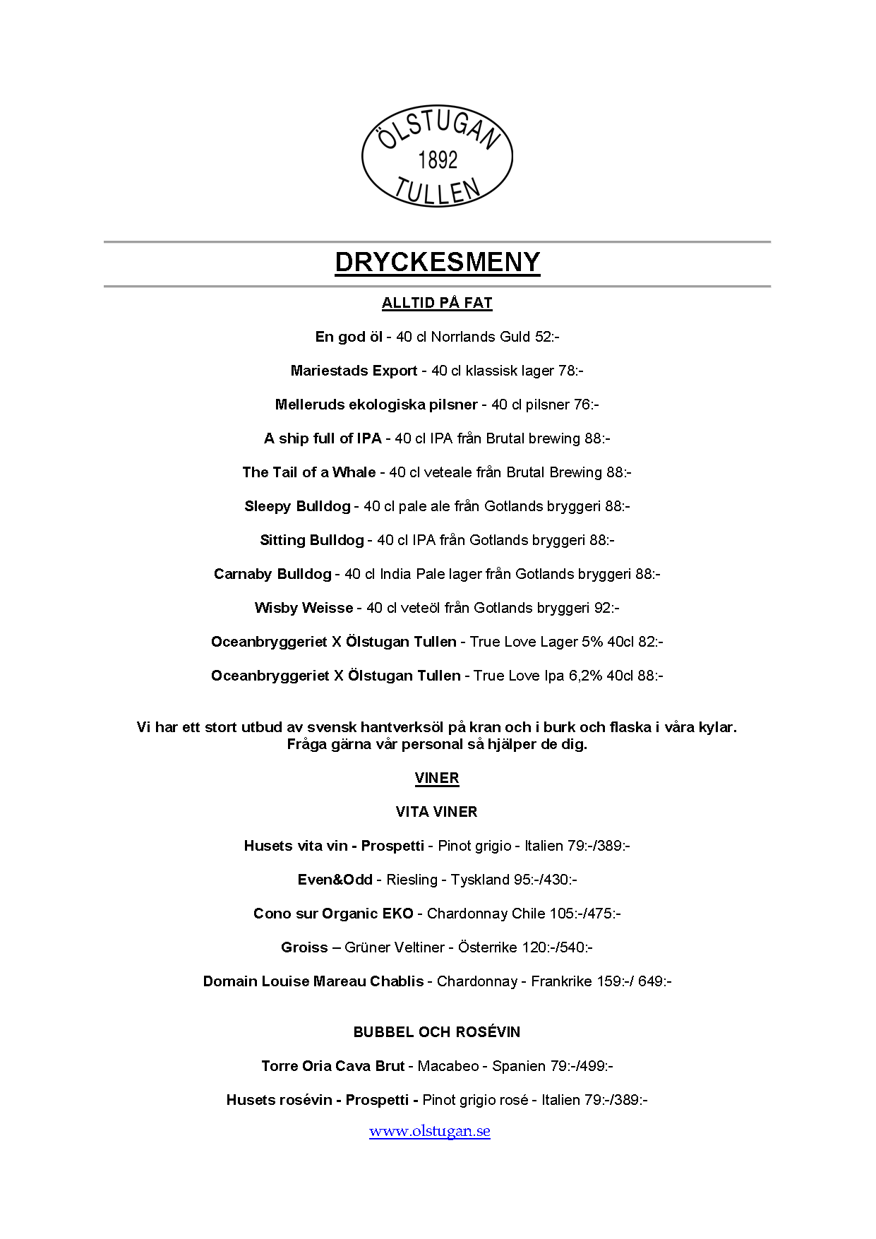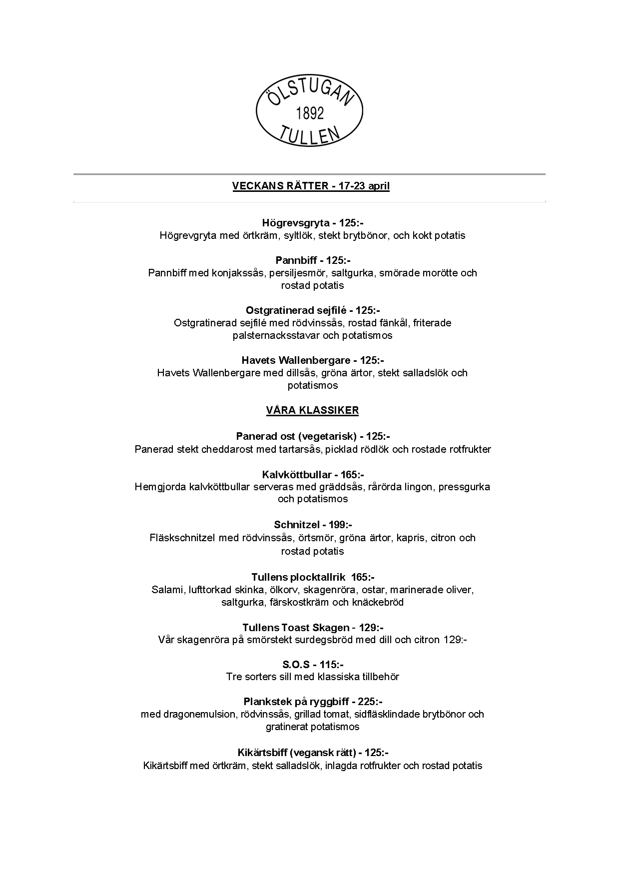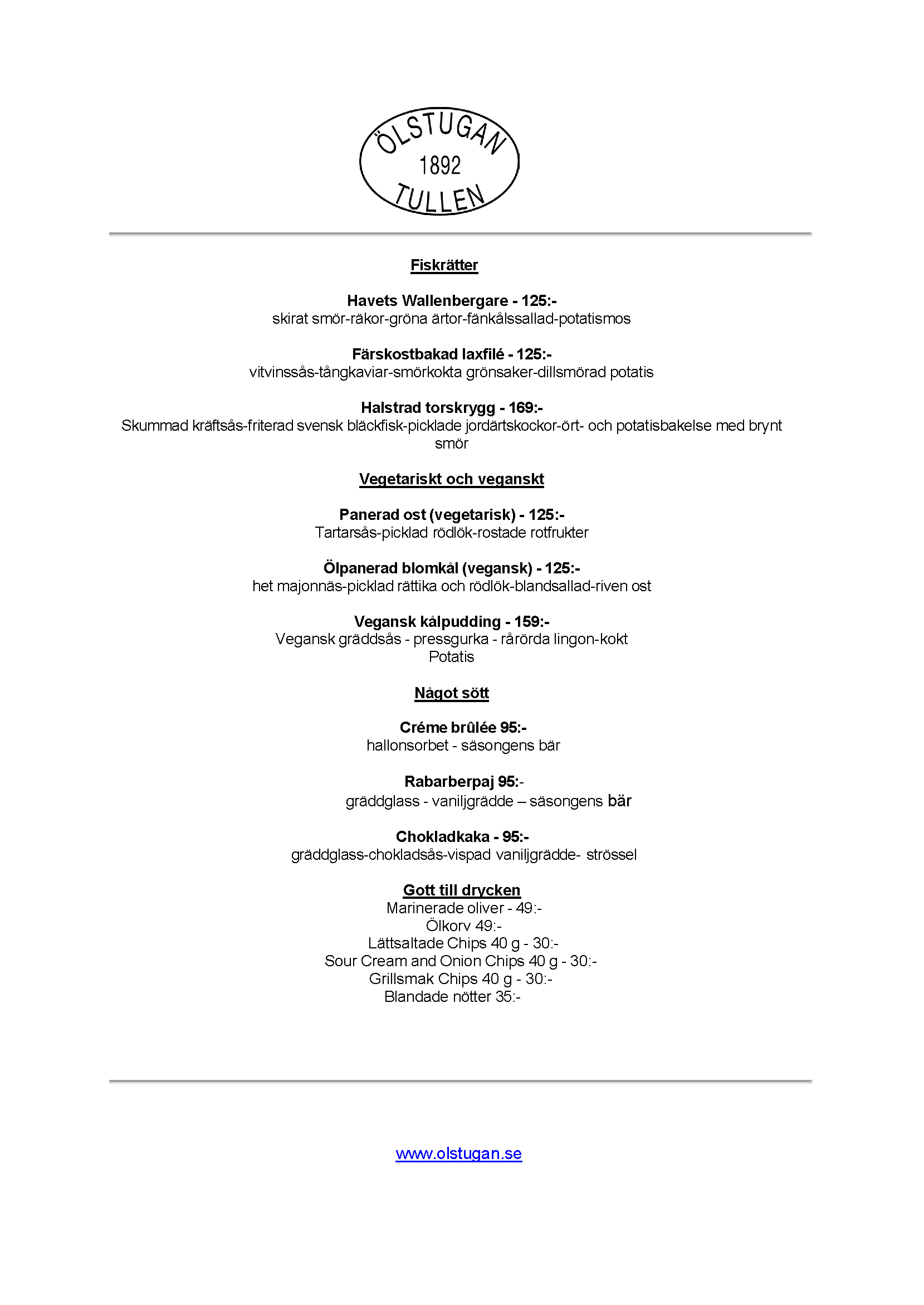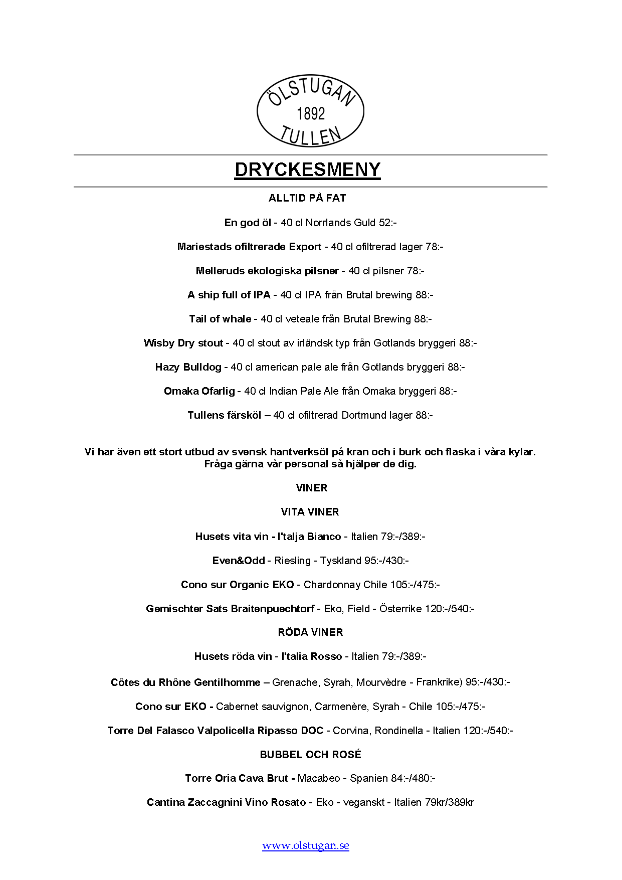 Vi erbjuder vällagad och varierad svensk mat till rimliga priser. För den törstige erbjuds ett stort sortiment av öl och dryck från hela Sverige.