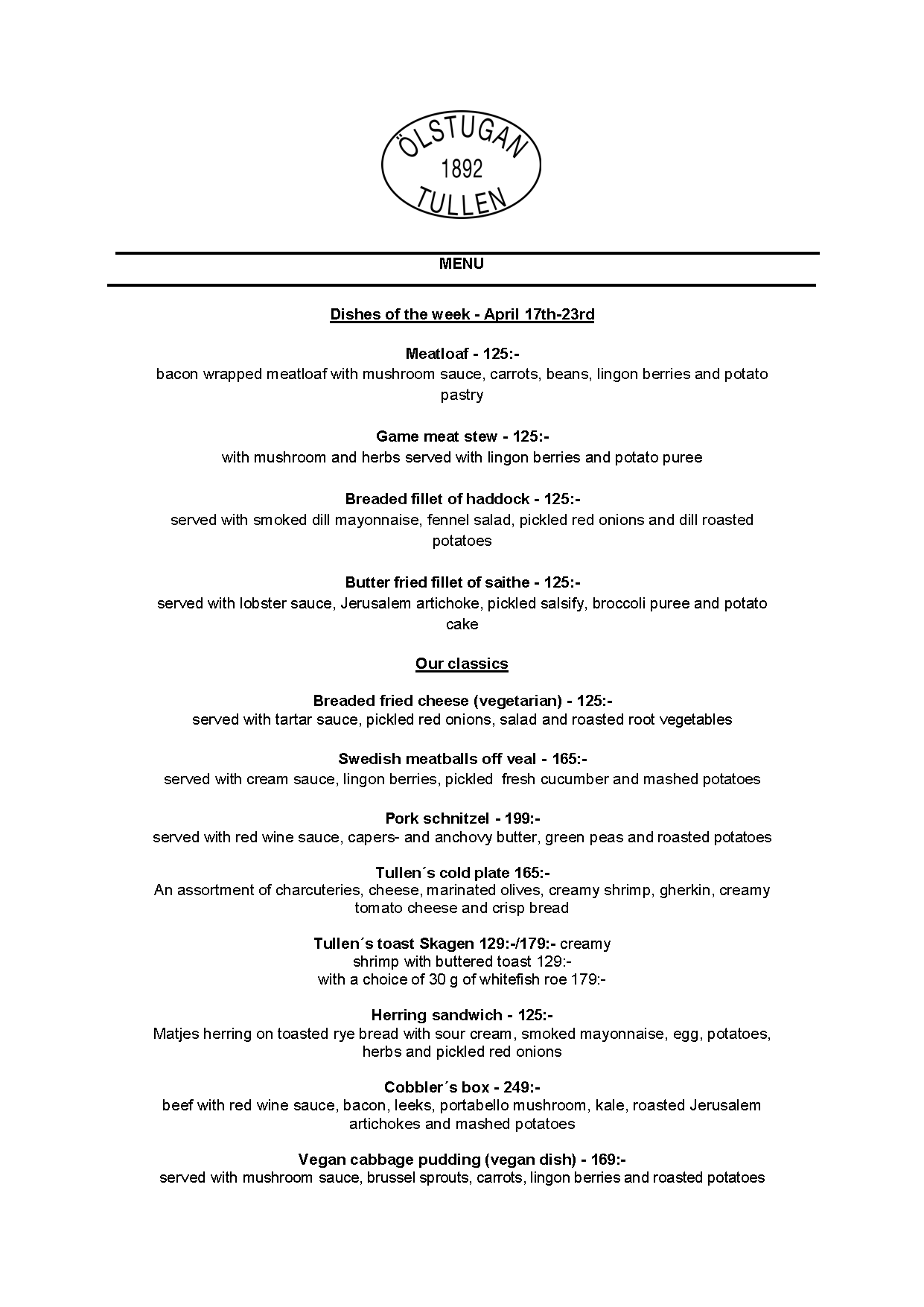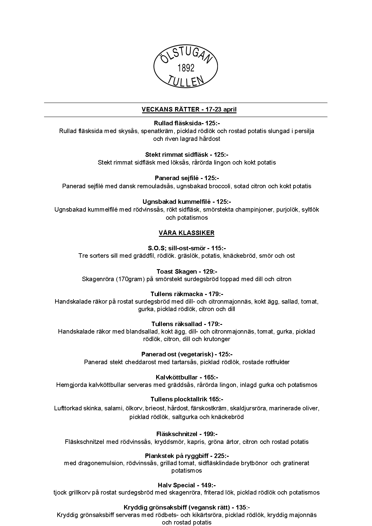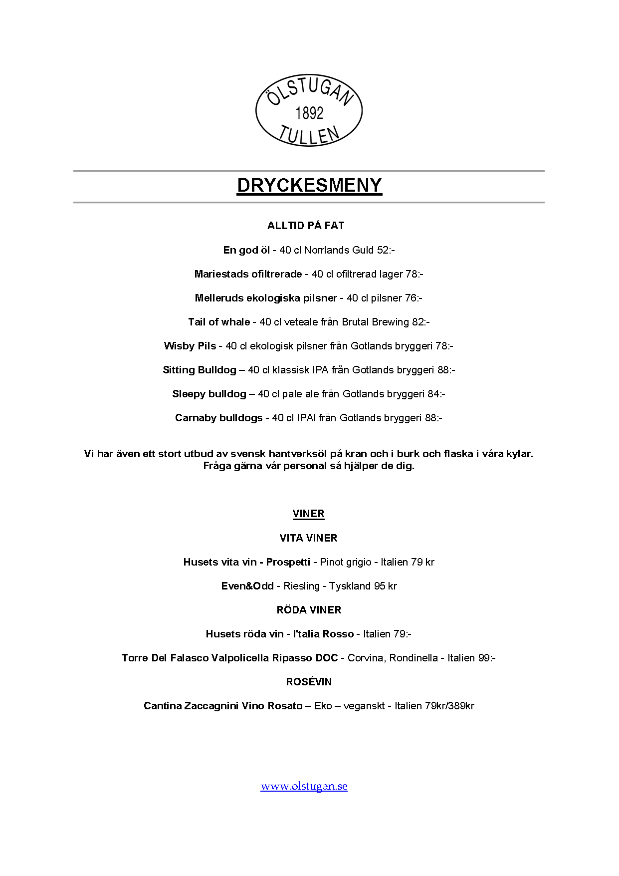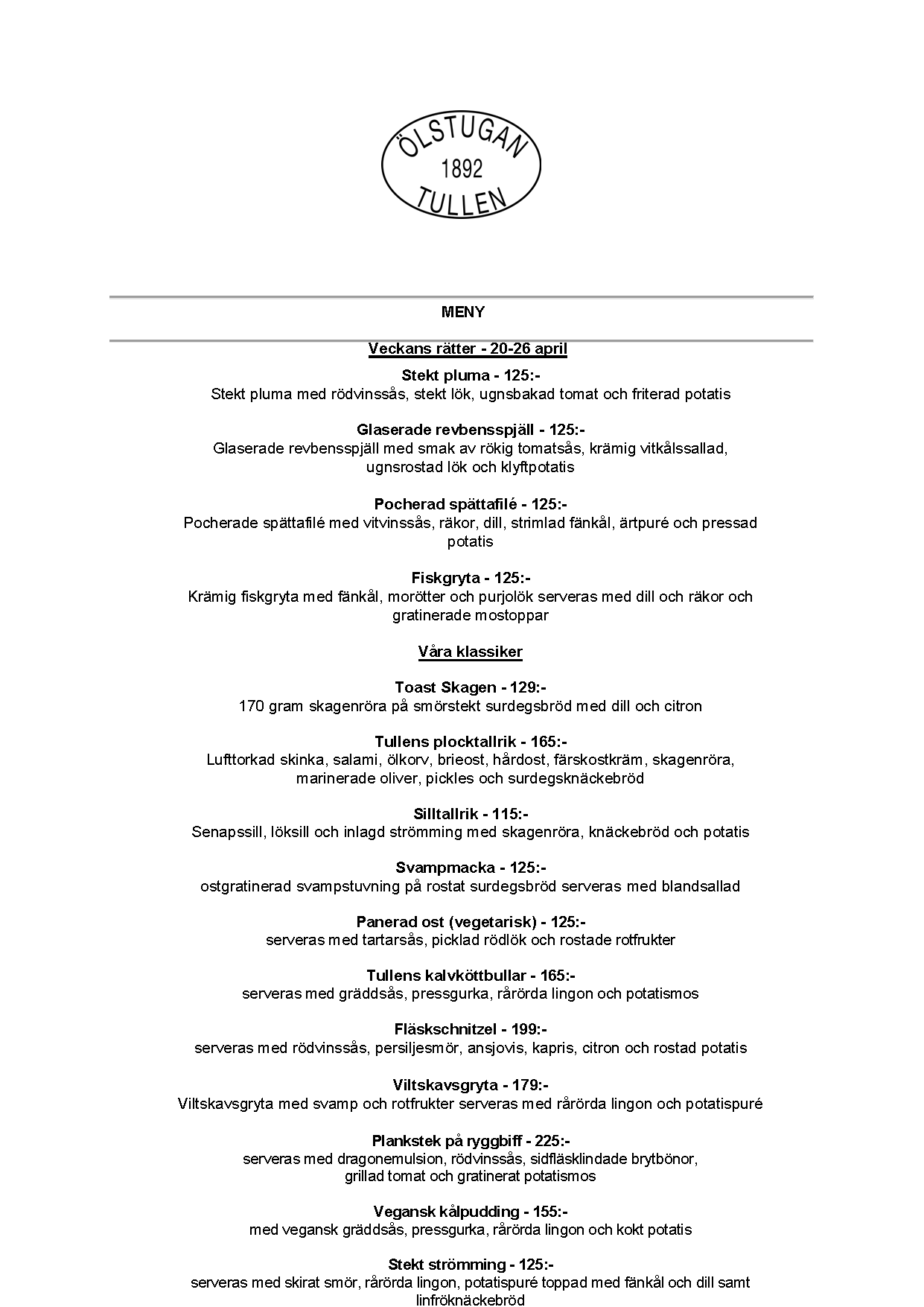 Vi erbjuder vällagad och varierad svensk mat till rimliga priser. För den törstige erbjuds ett stort sortiment av öl och dryck från hela Sverige.