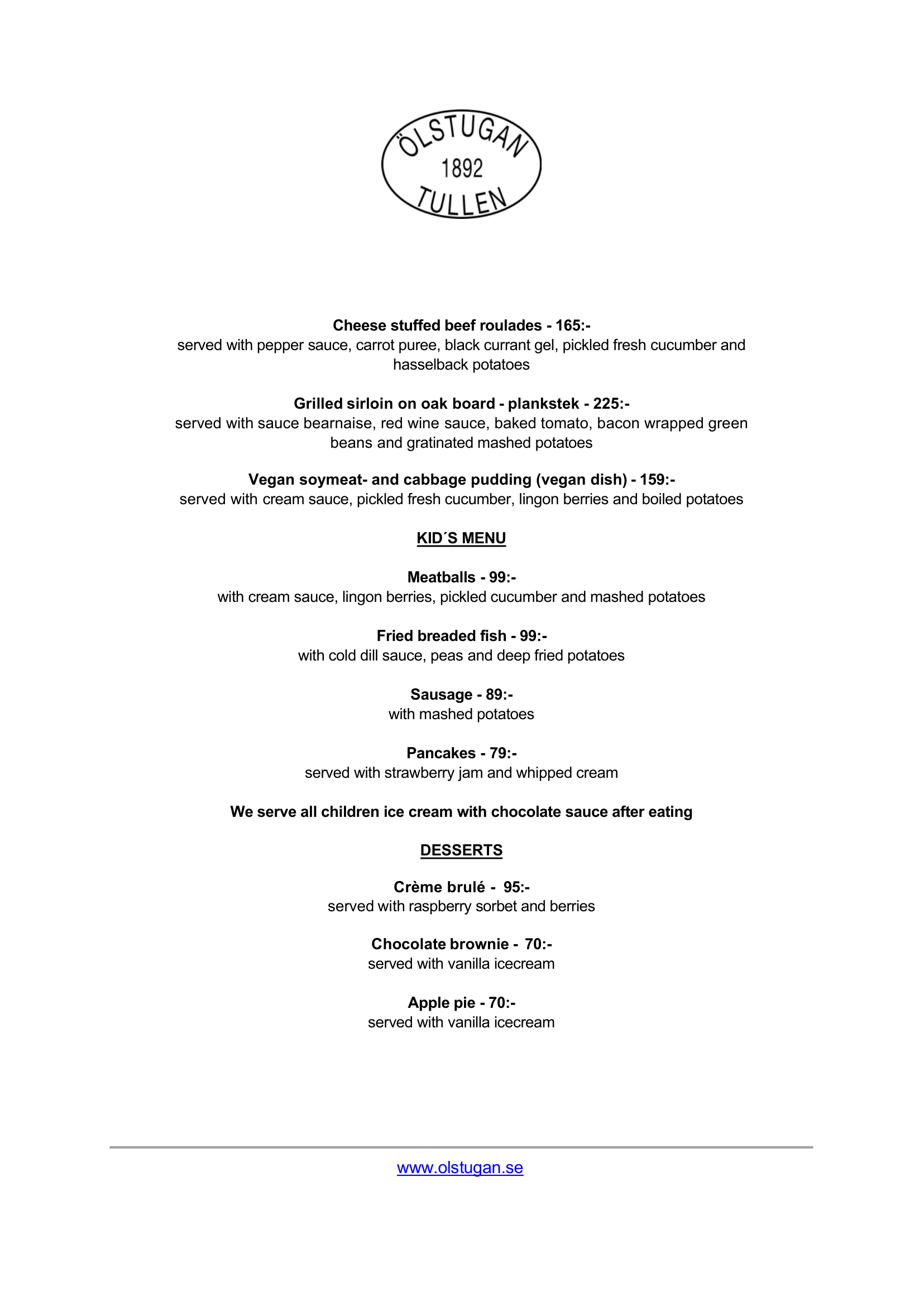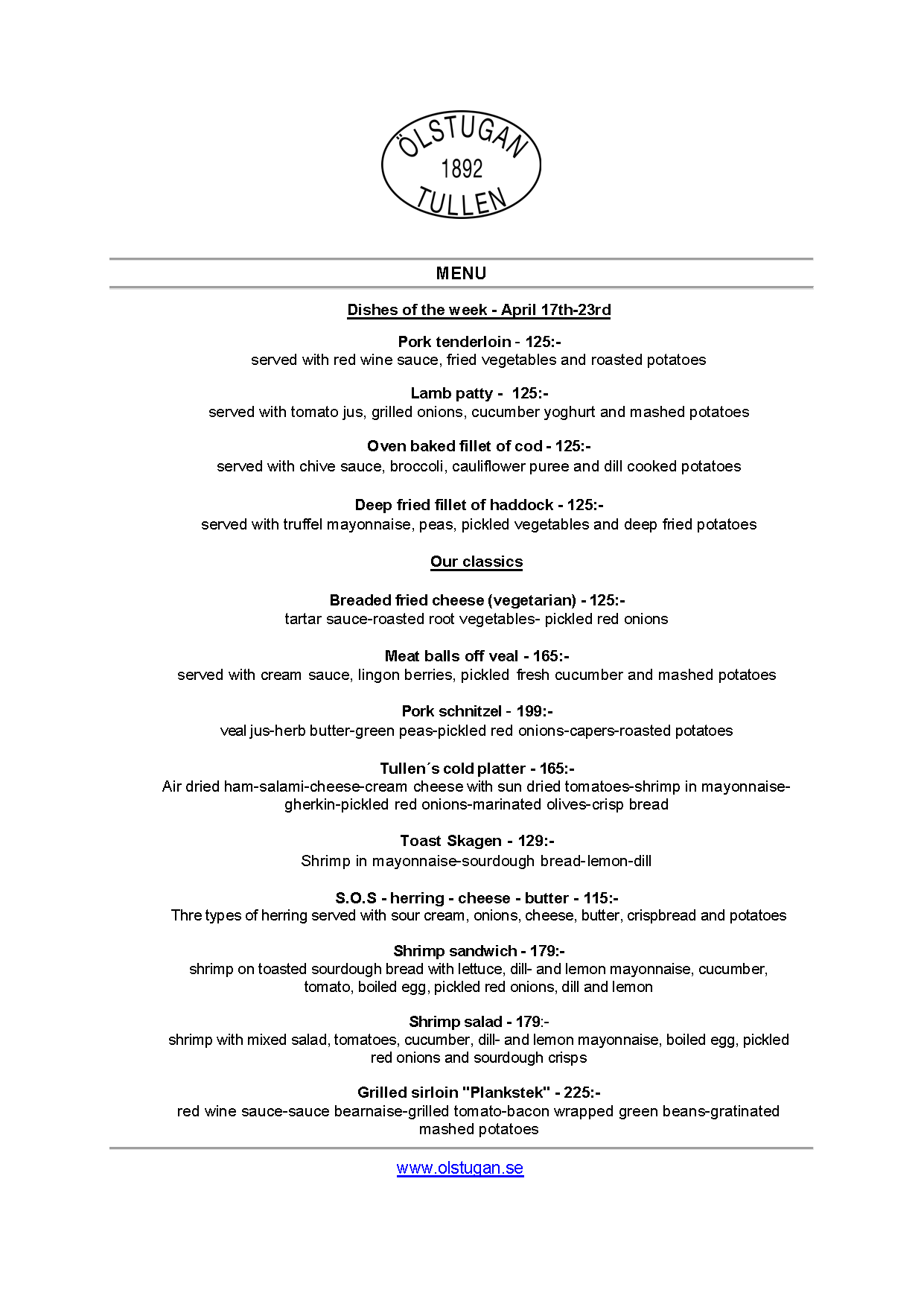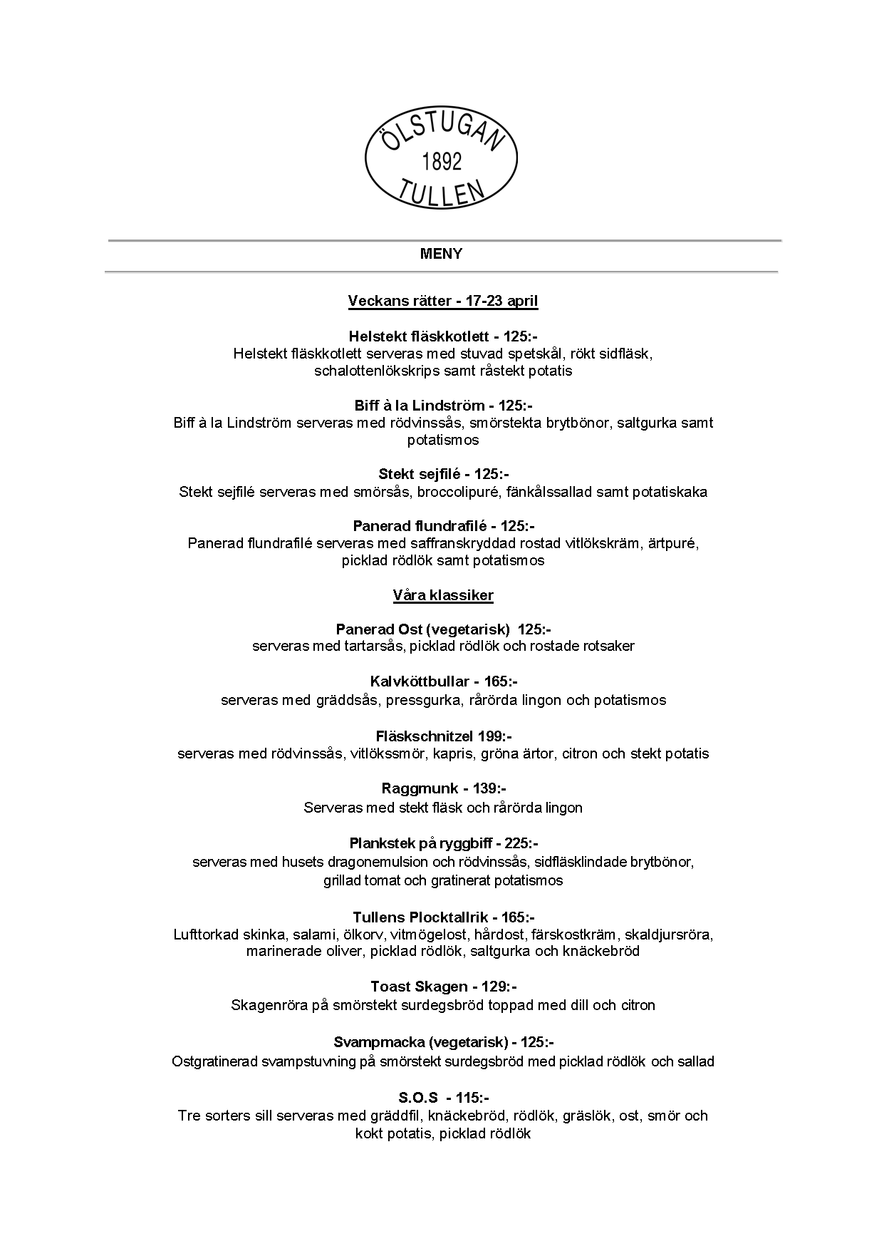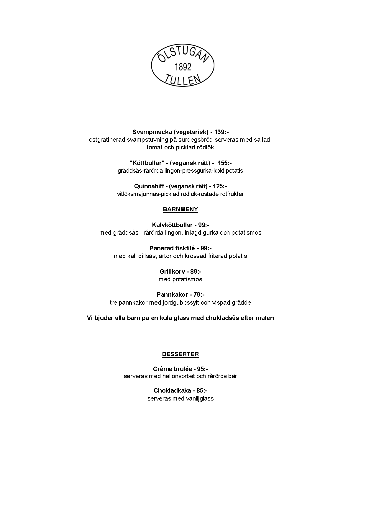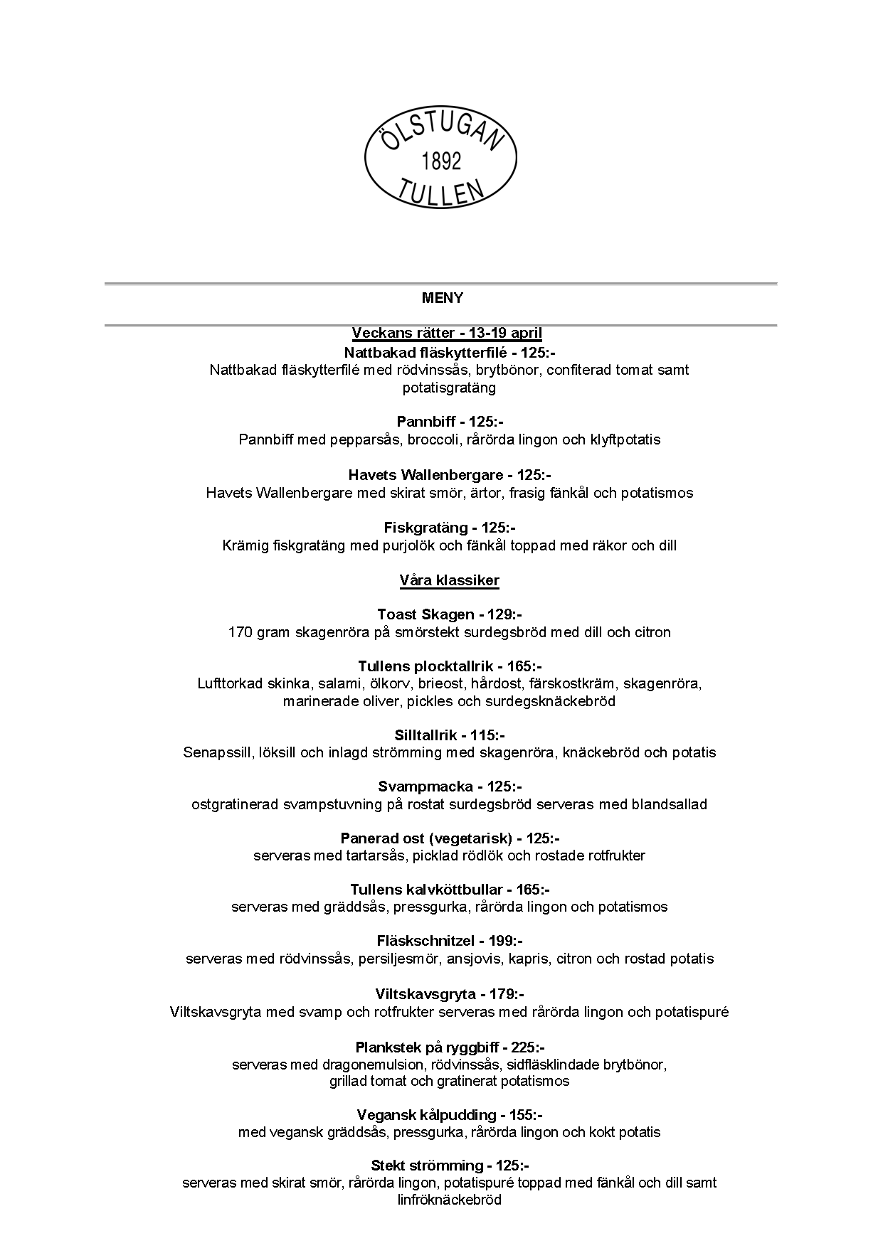 Vi erbjuder vällagad och varierad svensk mat till rimliga priser. För den törstige erbjuds ett stort sortiment av öl och dryck från hela Sverige.